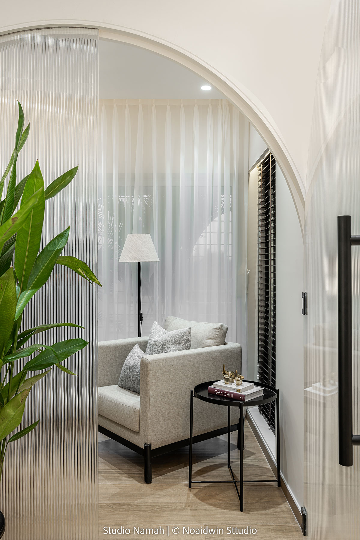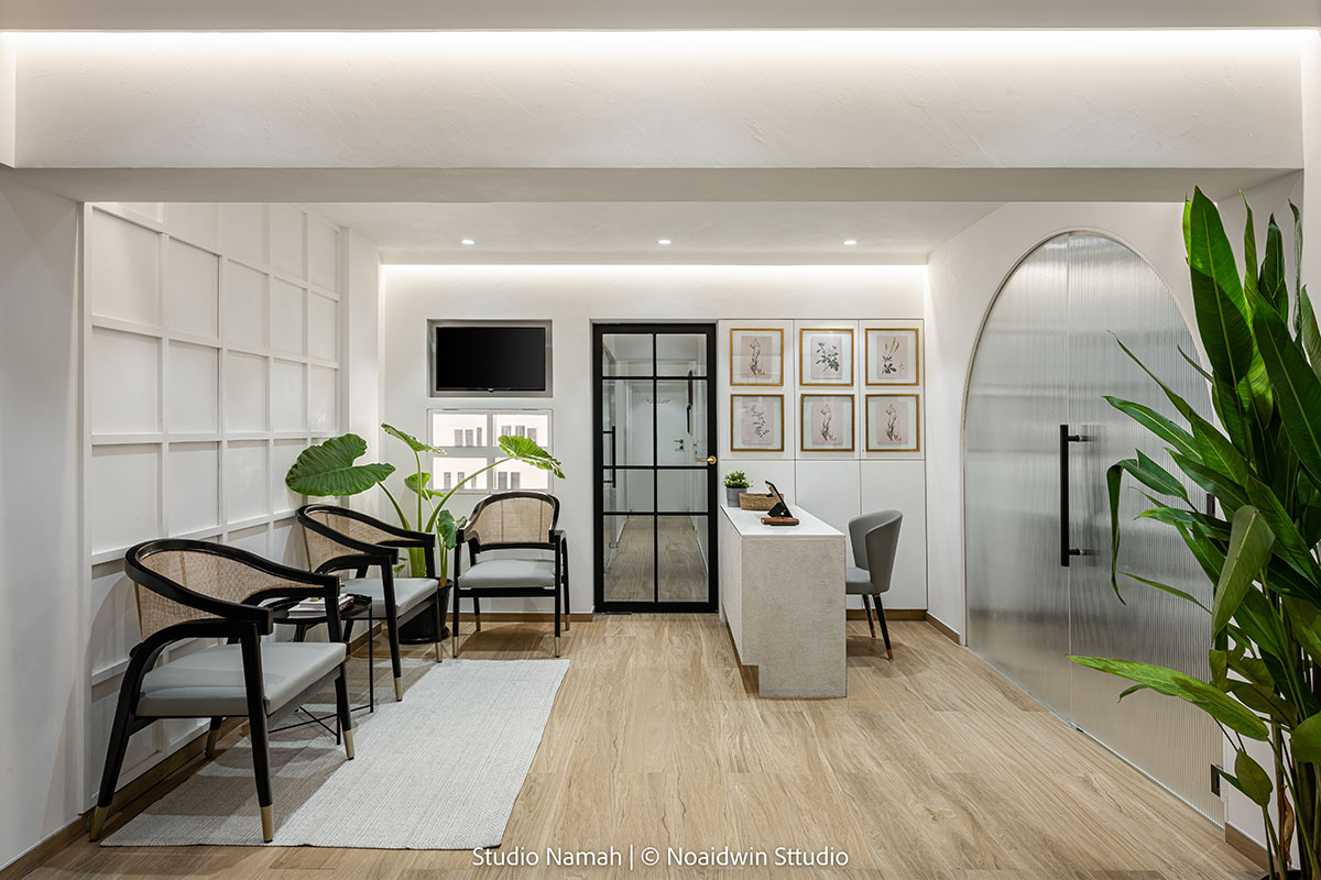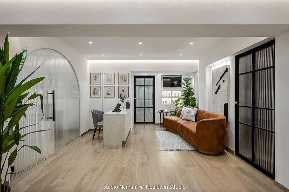 The backdrop to the reception area is a large arched door with fluted glass, defining the VIP waiting areas. Hazy shadows are visible through a diffused glow of light. Within, comfortable accent chairs are complemented by large planters and wooden shelving accessorised with earthy elements.