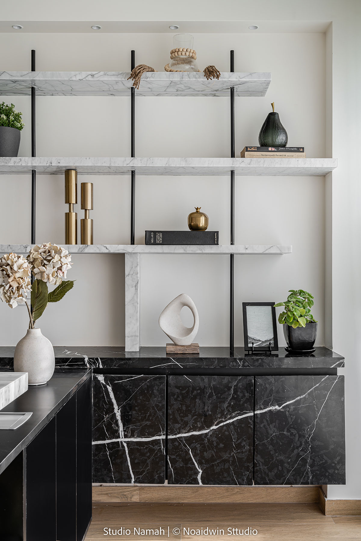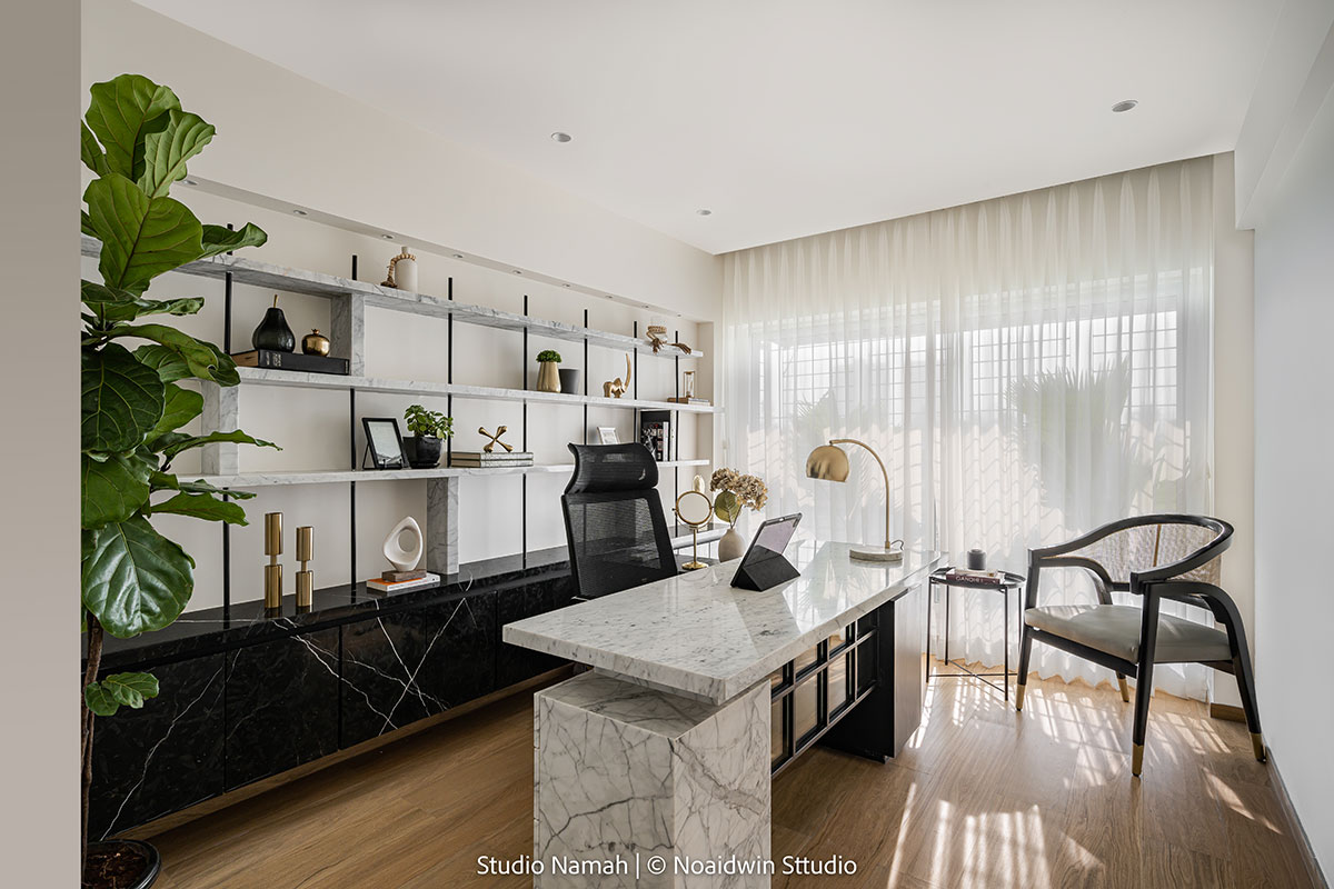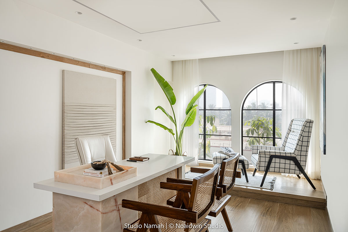 The dermatologist’s room employs softer and more feminine touches. Attention to small details shows in an off-centre painting on the wall behind the desk. “If we had placed it in the centre, it would not be visible when she sat in her chair,” says Shetty. Pink Michelangelo marble makes the base of the desk. Even the accessories on the wall shelves have been hand-picked, largely in sand, beige and biscuit tones to complement the colour palette. An interesting touch is the zen garden in a tray on the desk, used by the client for meditation and relaxation by raking patterns in the loose sand. A wicker modesty panel was customised under the desk, and an armchair with a footstool upholstered in a checked fabric is placed on a raised platform near the arched windows.