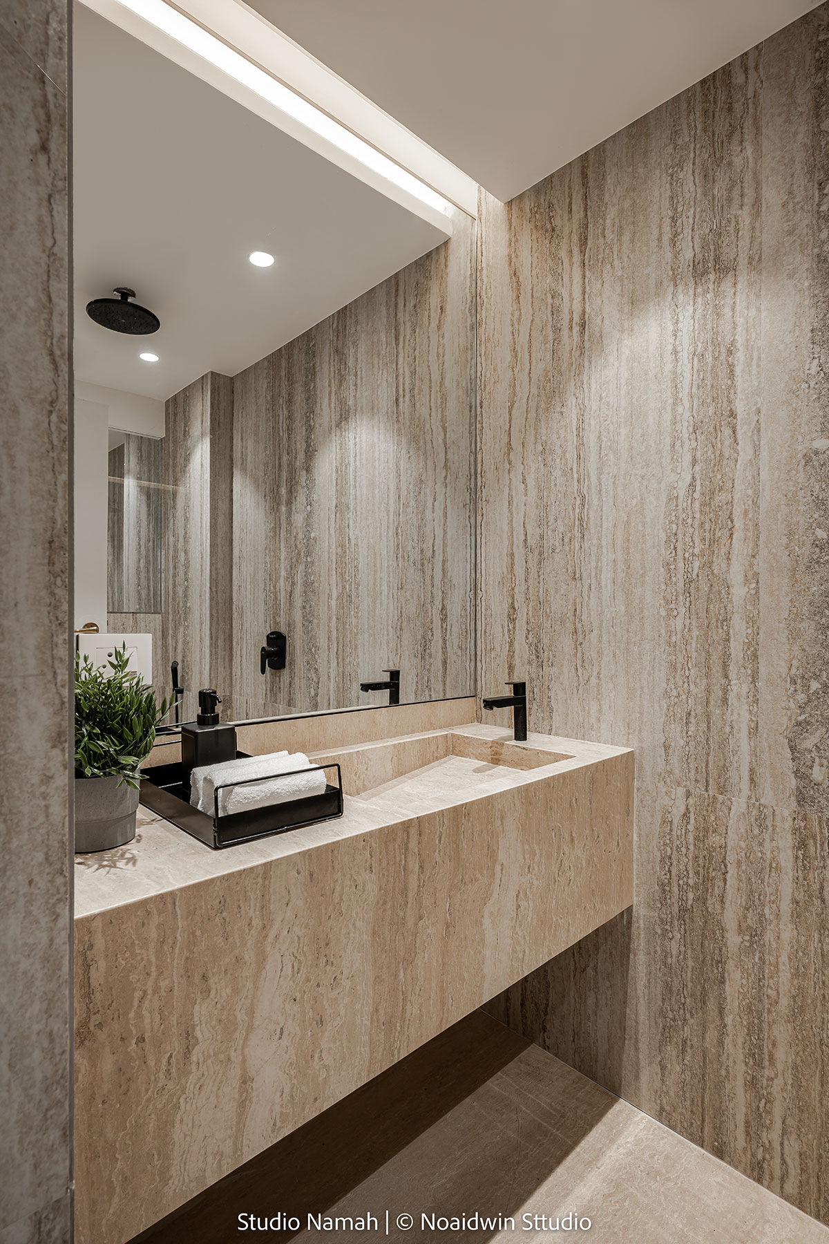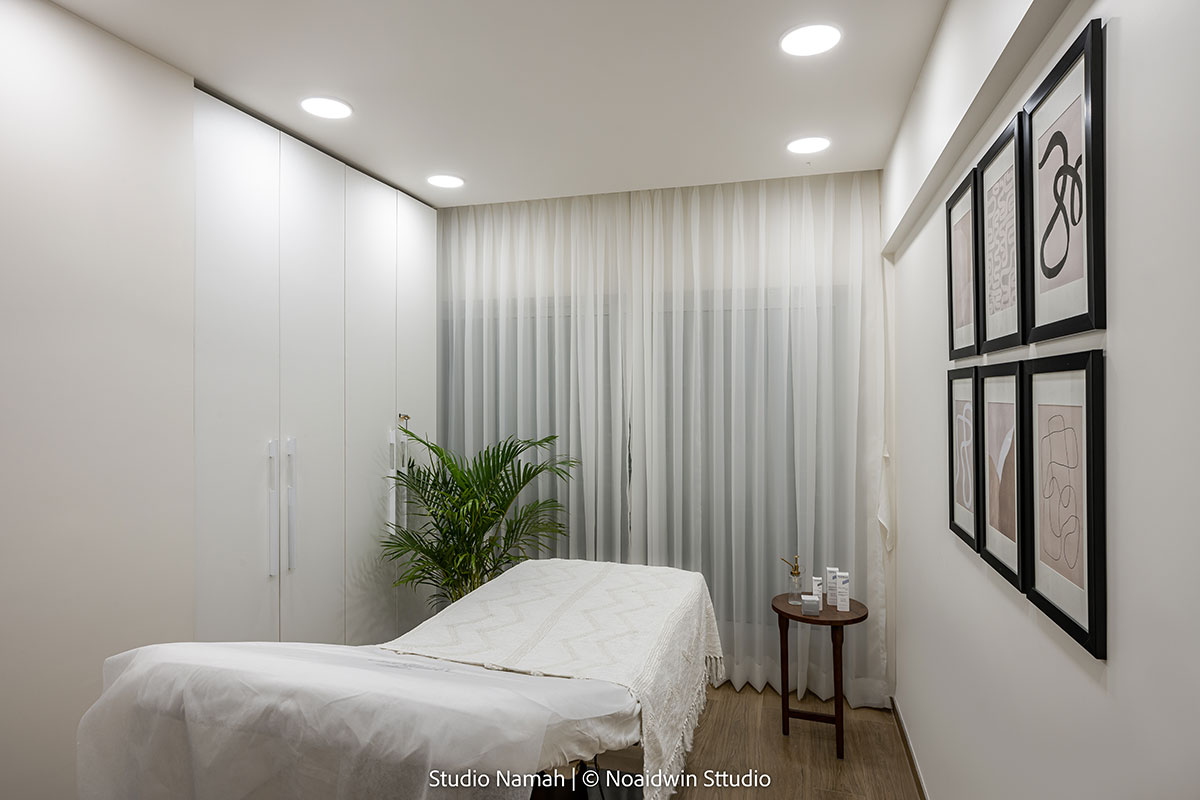 The plastic surgeon’s room is more conventional. White Statuario and Black Marquina marble lend a formality to the room, and the heavy marble shelving behind the desk subtly adds gravitas. The treatment rooms keep functional requirements in mind, with serene white walls, floor length sheer white curtains and abstract art on the walls creating a cocoon of calm. The plush washrooms are identical and could be in any high-end home. There is a travertine finish on the walls as well as counter that’s embedded with a customised washbasin. The ceiling spots cast arcs of light and shadow on the walls.