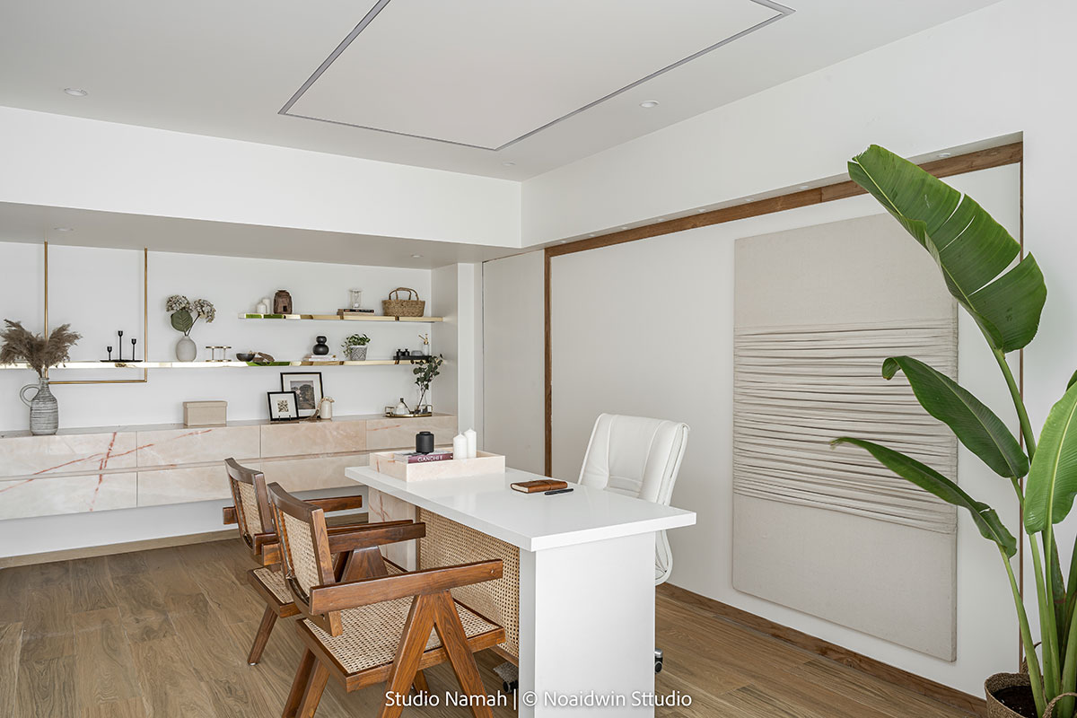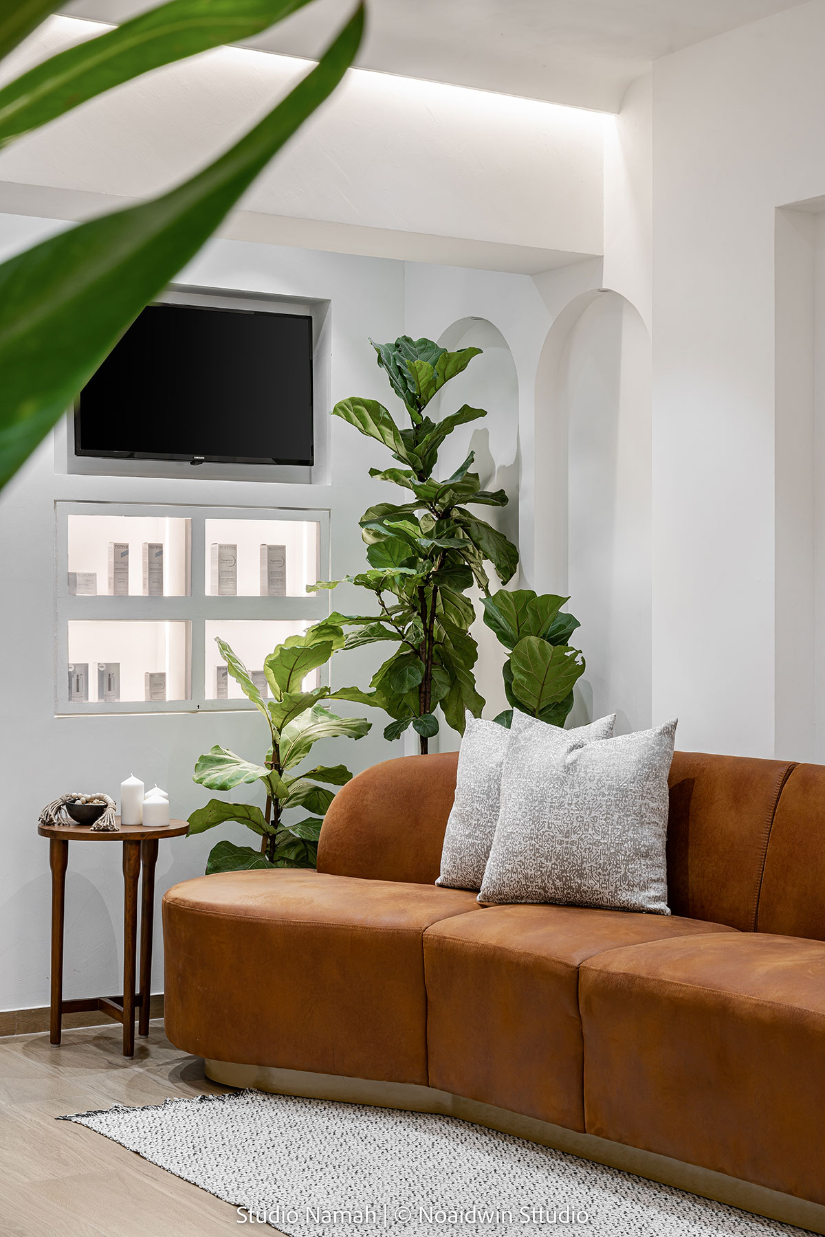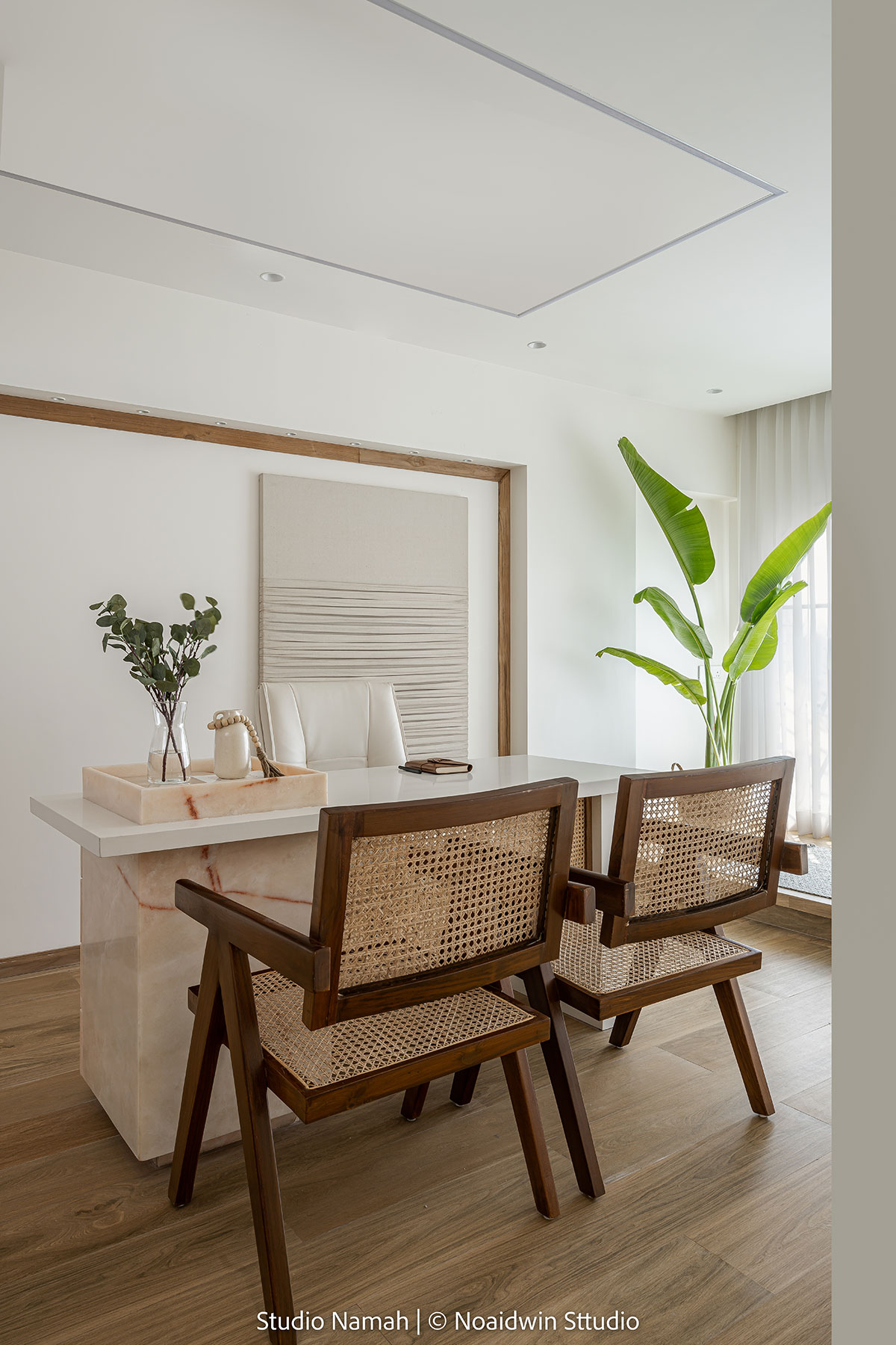 A common thread that runs throughout the spaces is white walls and sheer curtains. Wooden flooring anchors the look and customised wicker furniture adds to the relaxed aesthetic. A grid appears repeatedly in surface treatments—whether it is panelling on the walls created from MDF or a display of art, or the shelving, this ordered geometry seeps into the subconscious. Arched doors, windows and niches soften the linearity. A scatter of plants—large and small—uplifts and refreshes the spaces with a natural energy. Gold accents add a touch of luxury.