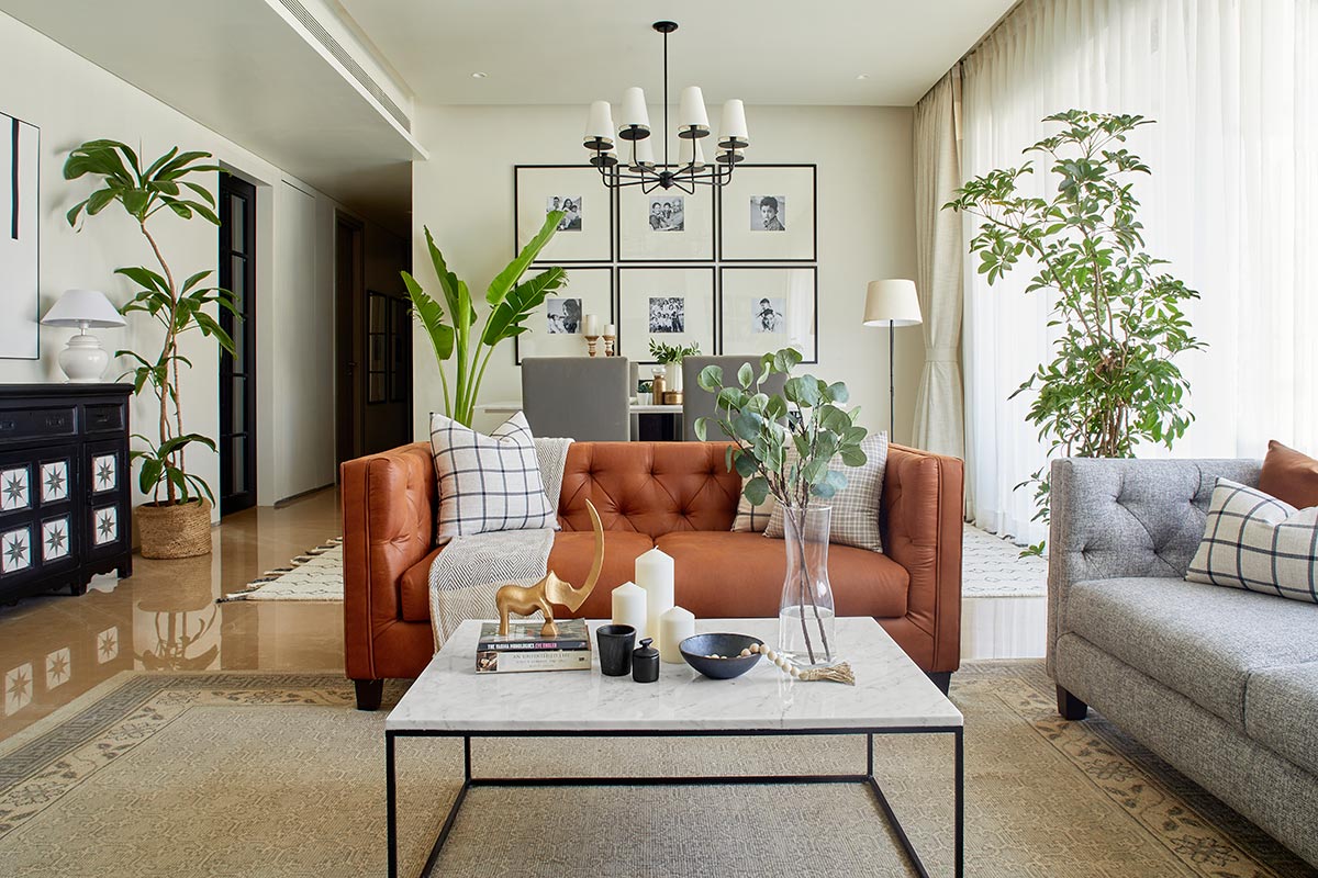 The Living room came with a marble floor which had a warm tone hence went well with a theme but was also a little overpowering, hence we preferred layering it with classic large carpets in the living and the dining area so as to balance the whole look.