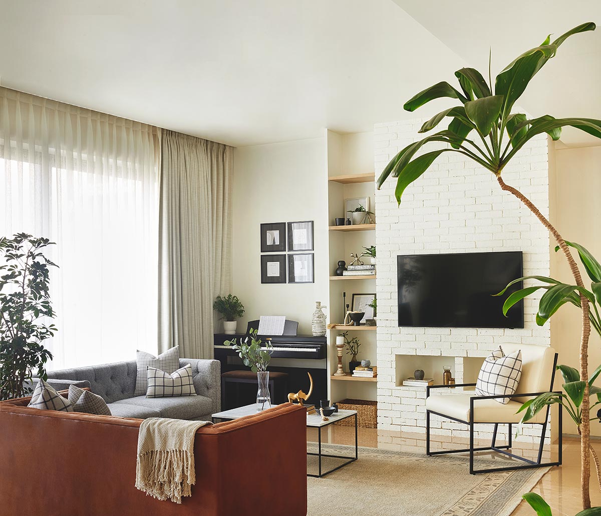 The entire house has a white canvas with highlights of black, tans , greys & light oakwood , in the form of furnishings , table tops , upcycled consoles etc. The tall greens enhanced and added the required nature’s touch.