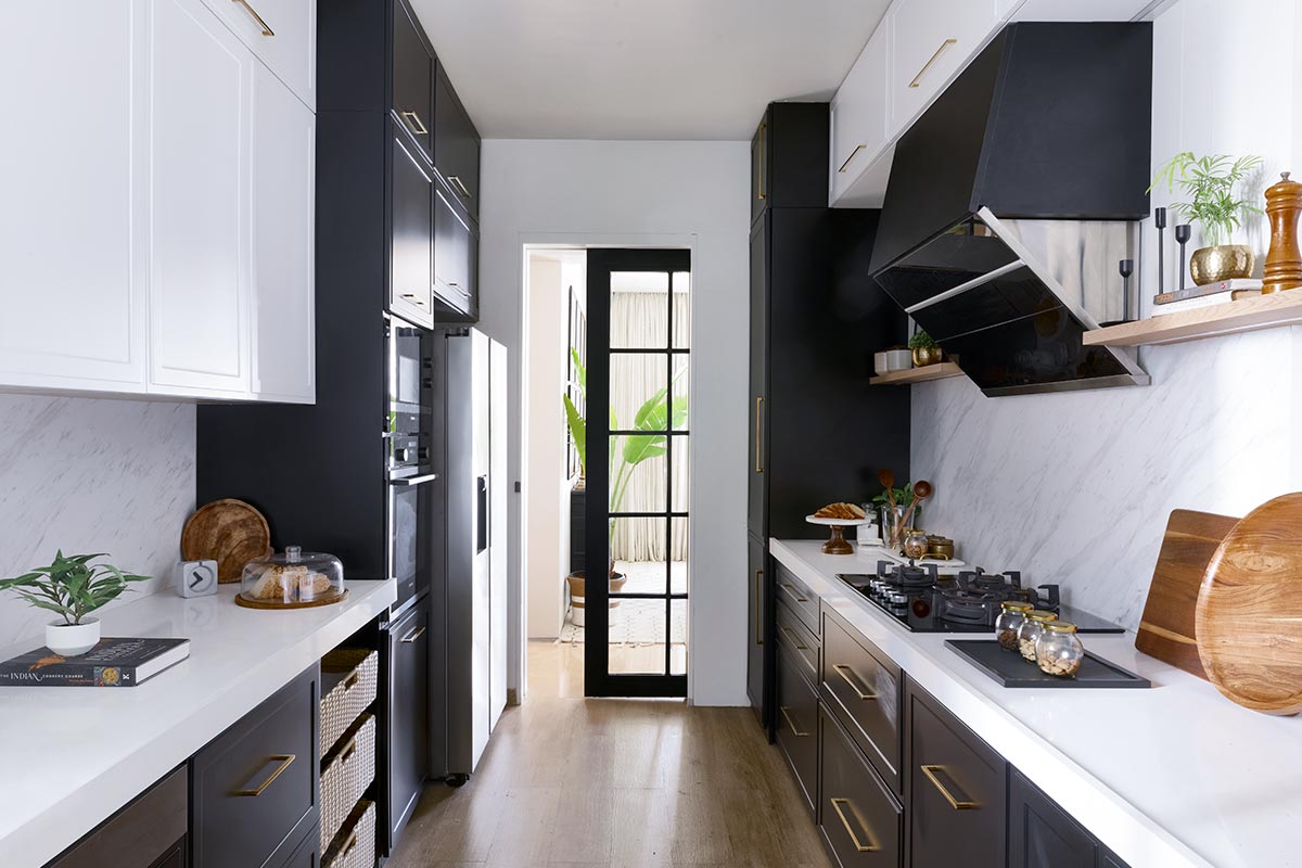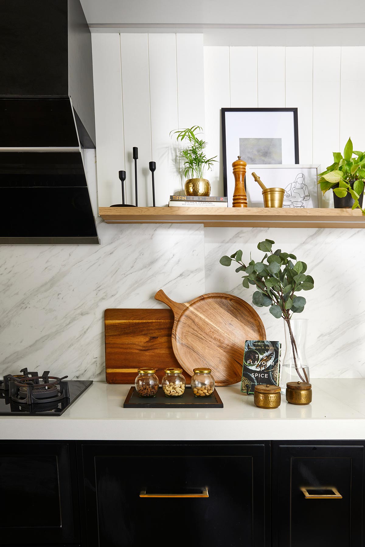 The kitchen was one of the spaces that was completely re-done from scratch. This was one of the spaces where Shrima wanted to shoot more often for her food blogging, hence We decided to bring in the vintage feels here with white platform and backsplash to give her the neutral backdrop for the blog. Instead of the regular overhead cabinets we decided to go for more open look with full ( wooden )shelves thus maintaining the minimal , clutter free design. The wooden looking floor tiles helped in adding some warmth to the monochrome kitchen.