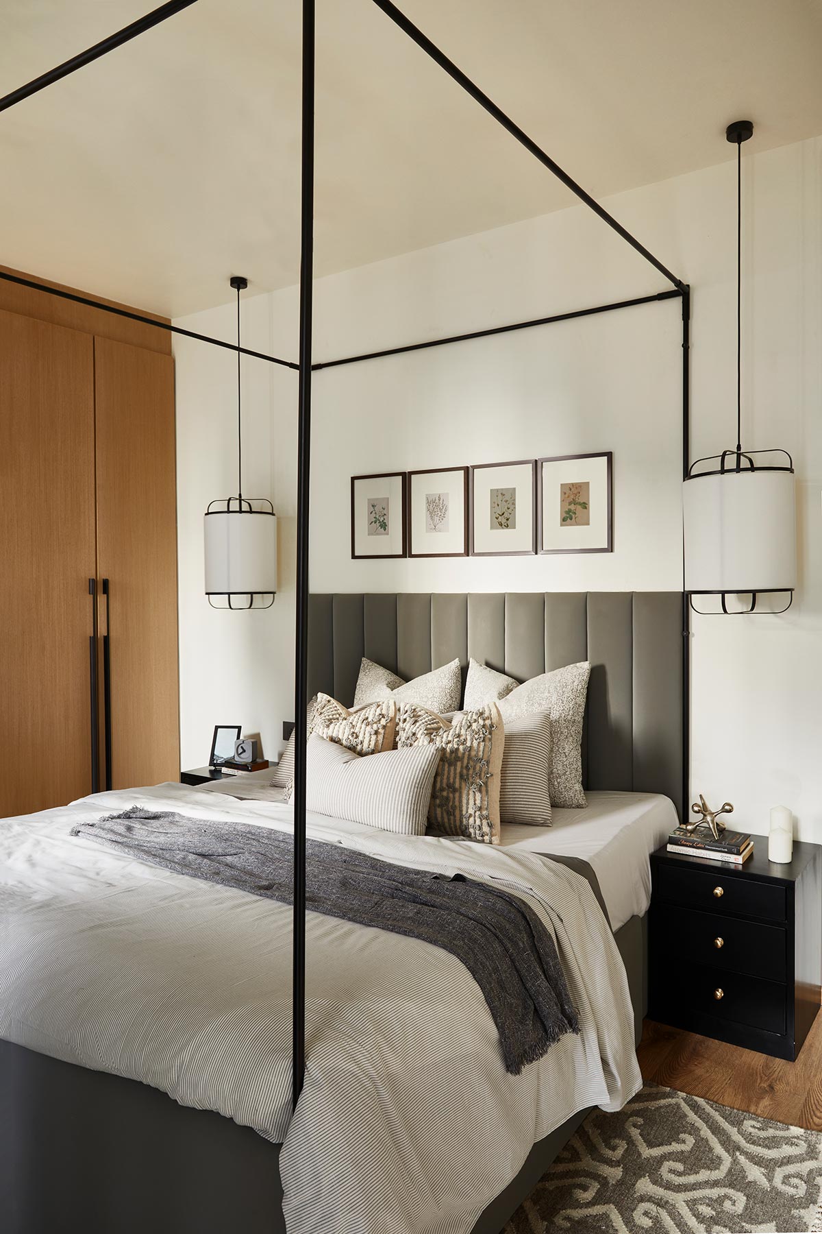 Master Bedroom : Shrima was worried that the room shouldn’t be too feminine for Aditya. Hence , we continued the neutral palate and tones where The upcycled master bedroom bed and the subtle veneer wardrobe were the highlights of the room which were complemented by the customised hanging lights and the vintage frames.