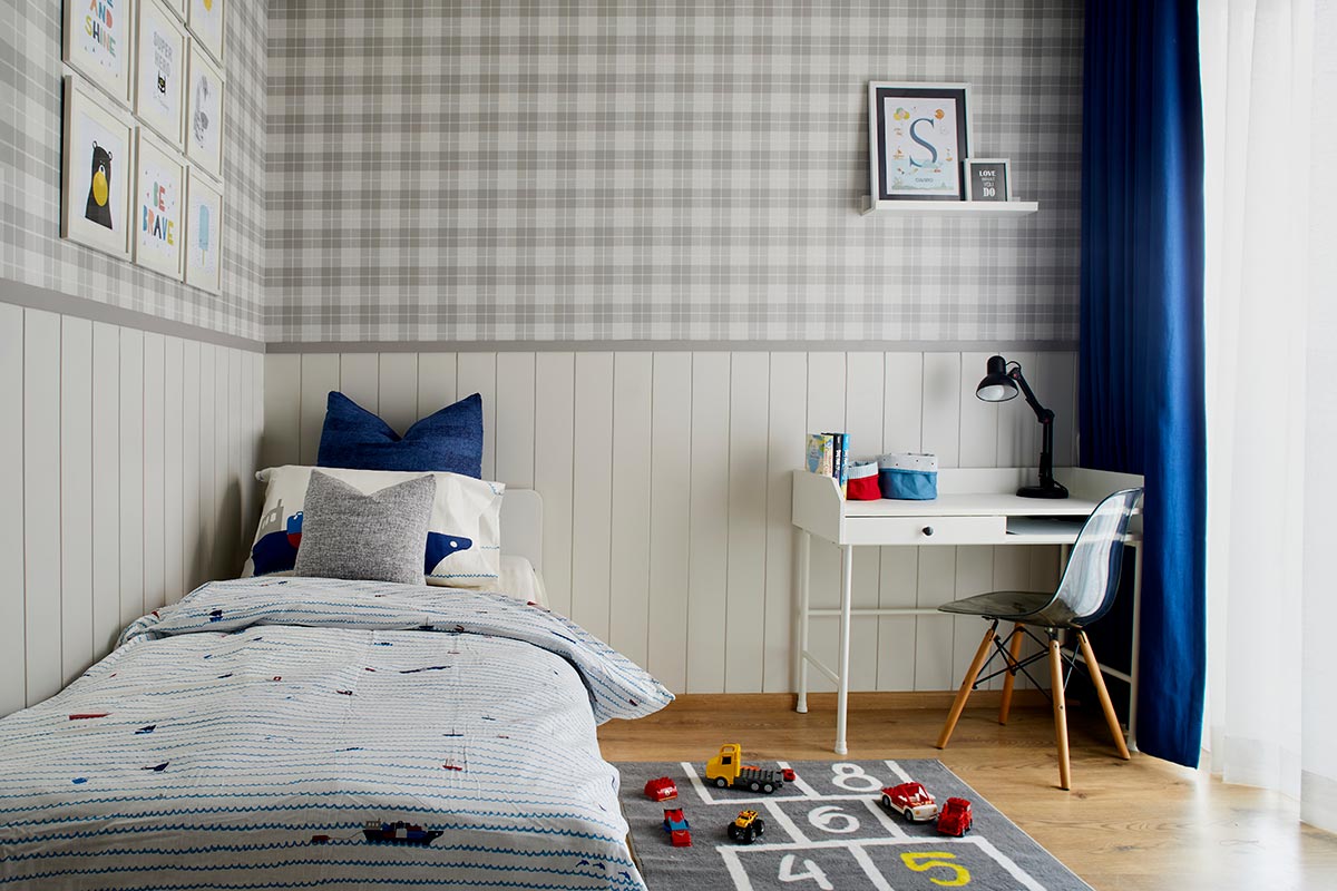 Hence, we contained the Scandinavian look in the kids’ room with the colours mainly coming thought the furnishings & artwork that they can change with time. The younger son’s room was characterized with white vintage panels, study & neutral wallpapers, whereas a bigger & rather modern and sleek study table was designed for the elder son with again a neutral wallpaper backdrop which he could retain for a long time.