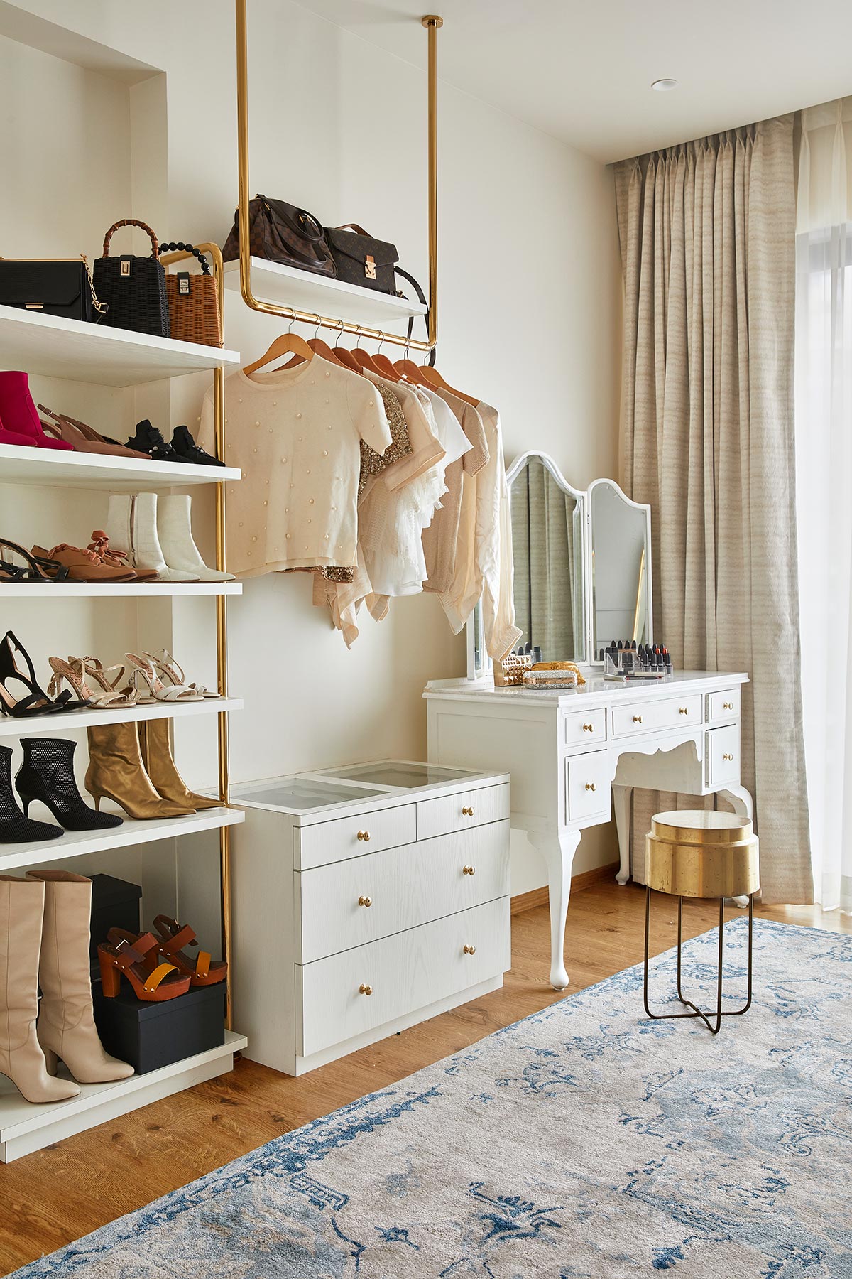 Studio: Since her proffession required her to work from home and shoot at home for content creation , she really needed a space where she could sit and ideate, shoot and create her work without bothering the rest of the house. By adding a little glam quotient with the gold accents and open storage units and the upcycled vanity , we tried giving her a space that reflected her inner Diva at the same time gave her , her own office space.